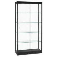 Expositievitrine met verlichting, snel operationeel. Vitrine met een robuuste en stevige constructie. Hoogwaardig gehard glas aan alle zijden (wanden, deuren en legborden). 2 schuifdeuren met slot. 2 ledspots aan het plafond, kleur instelbaar in 4 standen (2700/3000/4000/6000ºK).