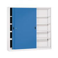 - Stevige hoge gelaste werkplaatskast met stalen schuifdeuren.