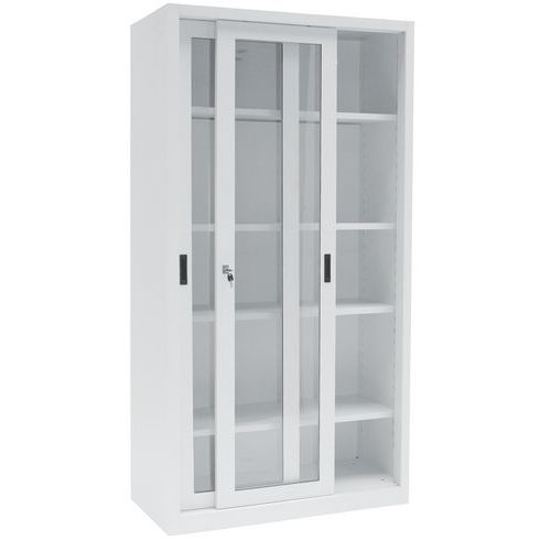 Duurzame kast uit één stuk van staal (0,9 mm dik). Met dubbele schuifdeuren om ruimte te besparen. Bepaal zelf de hoogte van uw legborden. Eenvoudig afsluitbaar met een slot. Met doorzichtige deur van plexiglas zodat u de inhoud kunt bekijken. Veiligheidstips: - Plaats het meubel op een vlak oppervlak - Bevestig het aan de muur of een scheidingswand met een speciale bevestiging - Let erop dat u de aanbevolen maximale belasting niet overschrijdt en zorg voor een goede verdeling