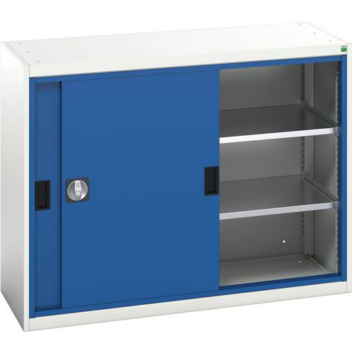 Gemaakt van plaatstaal met een slijtvaste gepoedercoate afwerking. Uitgerust met 2 x 925 mm schuifdeur. Geleverd met 2 gegalvaniseerde stalen legborden met elk 60 kg draagvermogen.