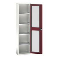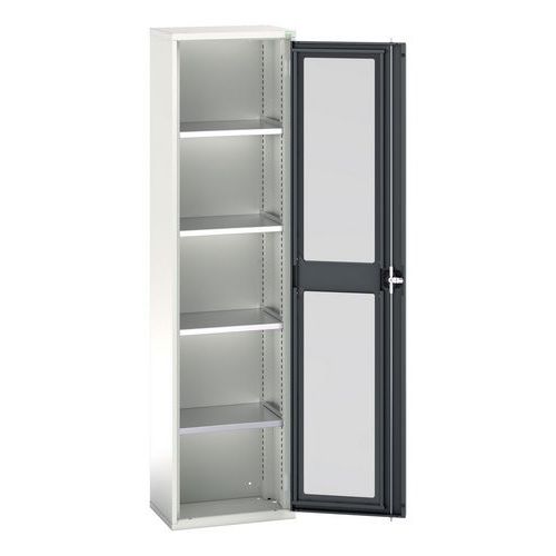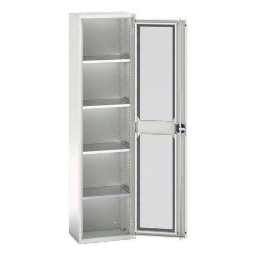 Kast Verso met transparante deuren en 4 verstelbare legborden: een gepersonaliseerde opbergoplossing. Optimale zichtbaarheid van de inhoud, voor eenvoudiger zoeken en organiseren van artikelen. De deur heeft een stalen frame en het venster is van Perspex. Gemaakt in het UK Max. belasting per legbord (kg) : 75 Max. belasting (kg) : 1000