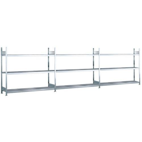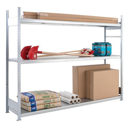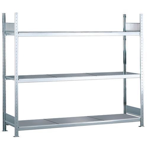 Stevige magazijnstelling, dicht plaatstaal. Stabiel zonder kruisschoor, toegankelijk van beide kanten. Perfect in combinatie met andere Easy-Fix stellingen. Hoge weerstand tegen corrosie dankzij afwerking van gegalvaniseerd staal.