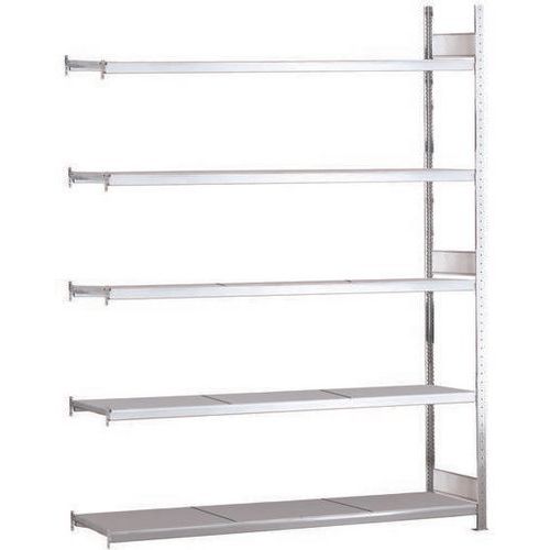 Stevige magazijnstelling, dicht plaatstaal. Stabiel zonder kruisschoor, toegankelijk van beide kanten. Perfect in combinatie met andere Easy-Fix stellingen. Hoge weerstand tegen corrosie dankzij afwerking van gegalvaniseerd staal.
