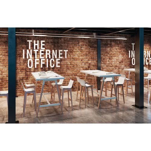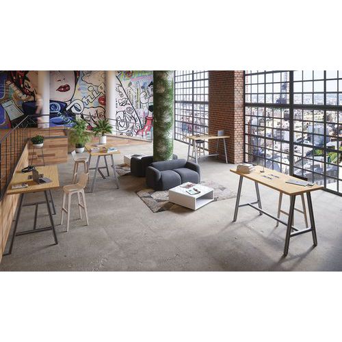 De hoge tafels Cohesion sluiten aan bij de nieuwe manieren van staand werken en stimuleert uitwisseling en samenwerking. De natuurlijke afwerking van de bladen in combinatie met de trapeziumvormige metalen onderstellen zorgen voor een industriële stijl. Bladen van honingraatpanelen, dikte 38 mm, met antireflectie- en antikrasbehandeling en met antibacteriële eigenschappen. Metalen onderstel met A-vormige boog, afgemaakt met een constructiebalk. Schokbestendige ABS-randen van 2 mm.