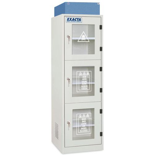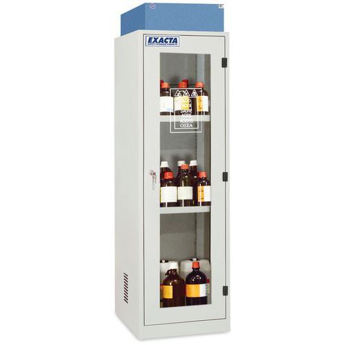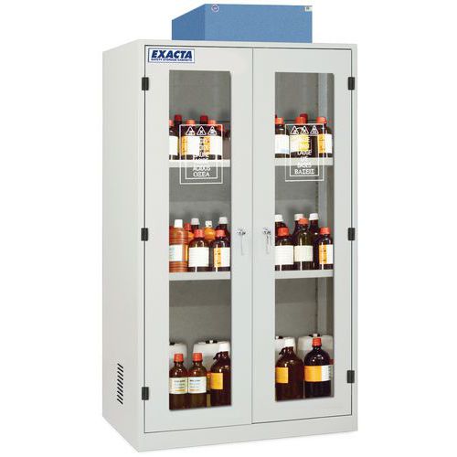 Robuuste veiligheidskast, geheel vervaardigd van elektrogegalvaniseerd plaatstaal met een dikte van 15/10 mm, koudgewalst. 4 dubbele draaideuren met ruit met veiligheidsglas 6 mm. Slot met sleutel. Deur opent 110°, waardoor de legborden zonder kantelen kunnen worden uitgenomen. Uitgerust met een filterventilatiebox die voldoet aan de norm AFNOR NFX 15-211.