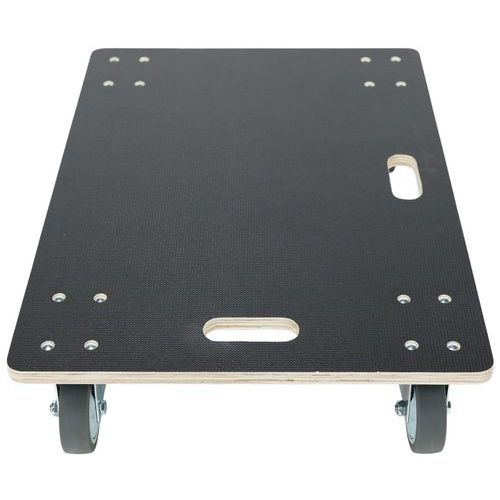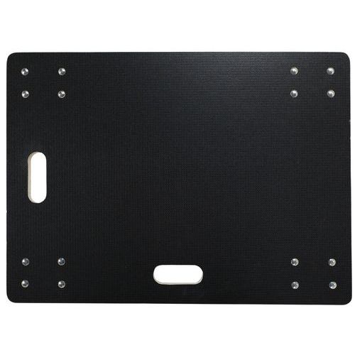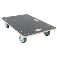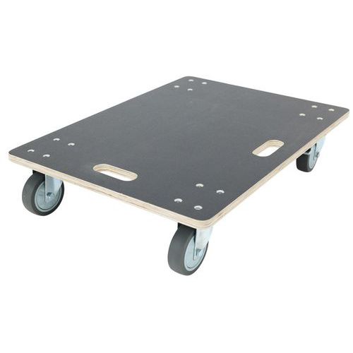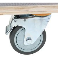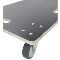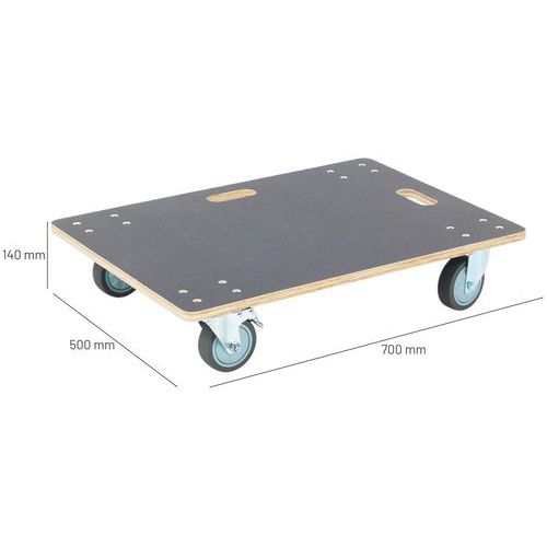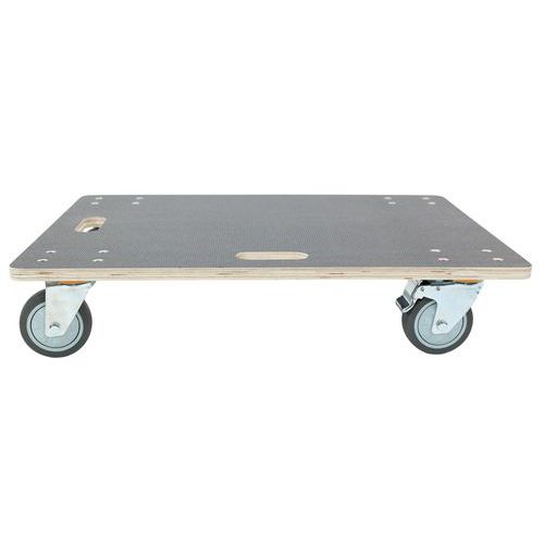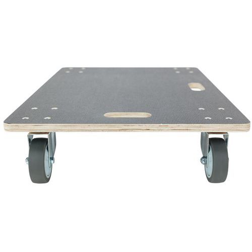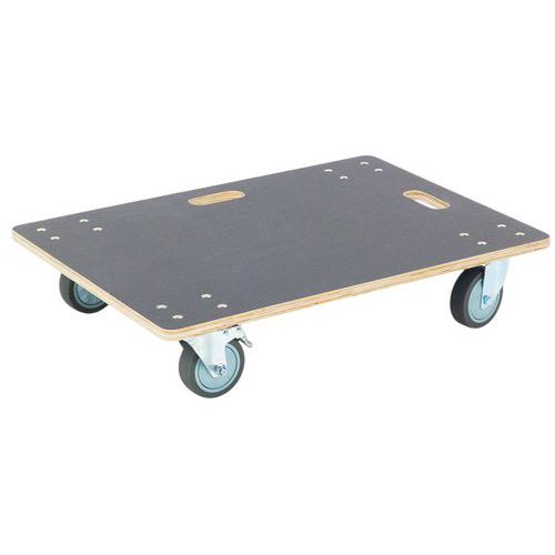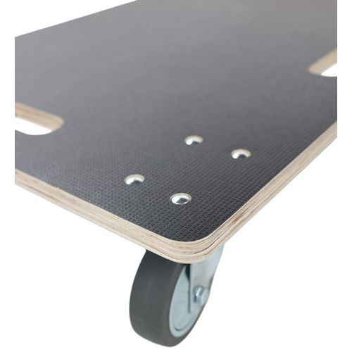 - Rechthoekig houten dolly met antislipbekleding. Met draagbeugel. Draagvermogen: 400 kg. Uitgerust met 4 zwenkwielen waarvan 2 met rem.