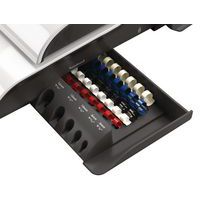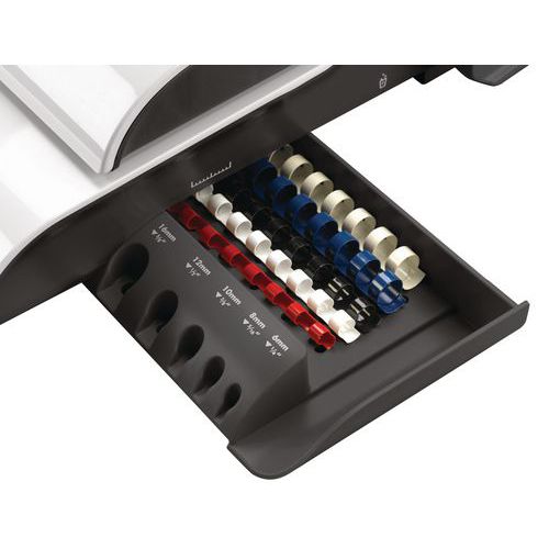 Gemakkelijk inbinden dankzij de gebogen steuntanden van de ring. Verstelbaar stopstuk om al uw documenten precies uit te lijnen. Inbindmachine voorzien van een opberglade met een lader voor dekbladen en documenten. Automatische openen van de opvanglade van het papierafval om verstopping te voorkomen. Inbindcapaciteit van 300 pagina's met dekblad met een maximale afmeting van 38 mm. Voor perforeren en inbinden