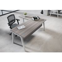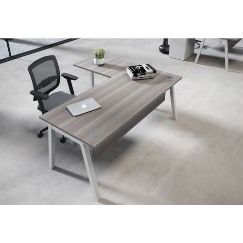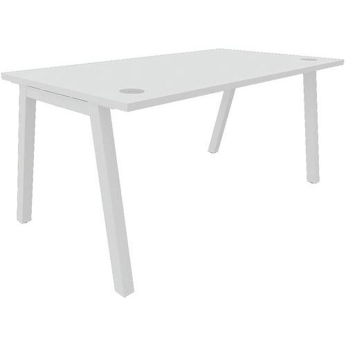 Ideaal individueel bureau met gemelamineerd oppervlak. Stroomvoorziening: het blad is voorzien van afsluiters voor de kabeldoorgangen. Gemelamineerd paneel, blad Structurex® met schokbestendige randen van ABS 2 mm. Onderstel met boogstructuur in de vorm van een schuine “A”. Ideaal voor thuiswerken