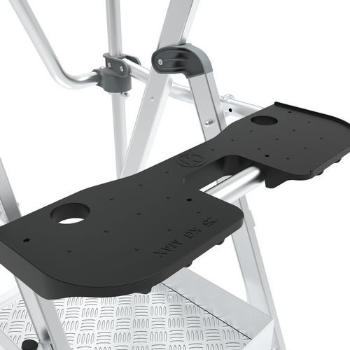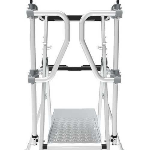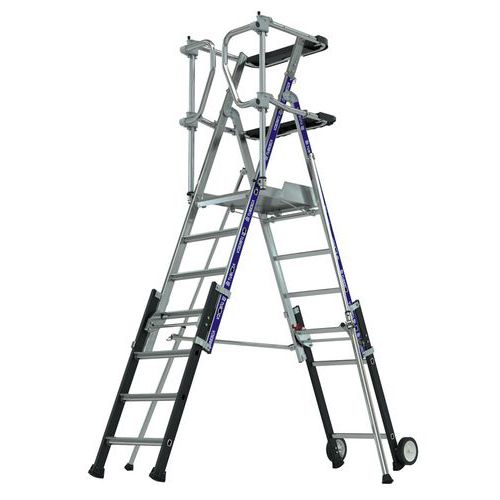 Inklapbaar platform Sherpascopic Saloon met vaste reling aan 4 zijden. Voorzien van een ‘Saloon’-hekje met automatisch inklapbare sluiting. Antisliptreden 80 mm (vast vlak) en 60 mm (uitschuifbaar vlak). Comfortabele aluminium antislipvloer. Intrekbare stabilisatoren met afstelling in millimeters. Telescopische delen om de hoogte te verstellen. Intuïtief en veilig stelsysteem, stapsgewijs met 23 cm. Voorzien van een verwijderbare gereedschapshouder met vakindeling en een weerstand van 25 kg met geïntegreerde haken (max. 10 kg).
