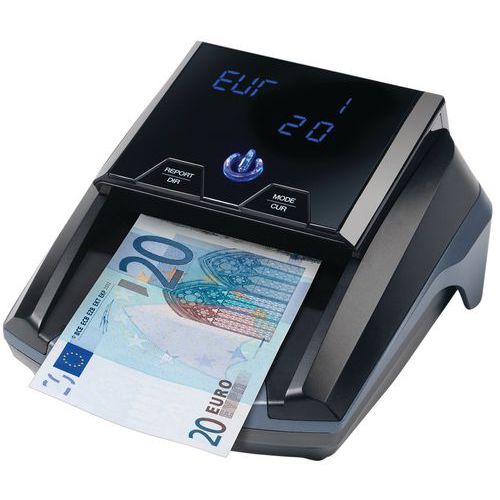 - Compacte automatische valsgelddetector voor biljetten met verwijderbare stapelaar. Snelle controle van bankbiljetten in vier richtingen voor alle voorgeïnstalleerde munteenheden. Controleert maximaal zeven veiligheidskenmerken van bankbiljetten. Regelmatig getest door de centrale banken om een nauwkeurige detectie van 100% te garanderen. Wanneer een verdacht biljet wordt ontdekt, wordt een foutmelding weergegeven en wordt een alarm afgegeven.