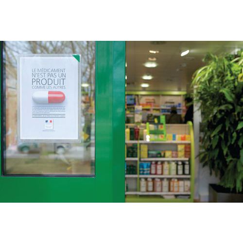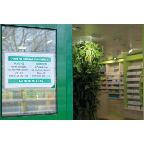 - Ideaal voor het presenteren van documenten op glazen wanden en vitrines (transparant aan beide zijden).