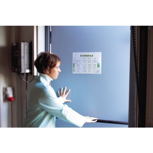 Magnetische insteekmappen Kang Easy Load kunnen op alle metalen oppervlakken worden bevestigd. Voor A4-documenten. Volledig magnetische rug voor een optimale hechting. Documenten zijn eenvoudig te plaatsen door de opening aan 2 zijden. Hoeksluiting Easy Load: handig en efficiënt voor het insteken en uitnemen van documenten. Kan staand of liggend worden gebruikt. Eenvoudige en snelle montage, zonder schroeven of spijkers. Kan worden losgetrokken zonder sporen na te laten. Kan staand en liggend worden gebruikt. Een presentatieoplossing voor gebruik op machines, deuren, metalen borden, koelkasten... Map van PVC met magnetische rug. Ruimte voor maximaal 10 vellen papier van 80 g. Volledig groene achterwand.