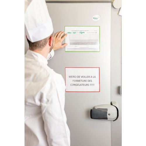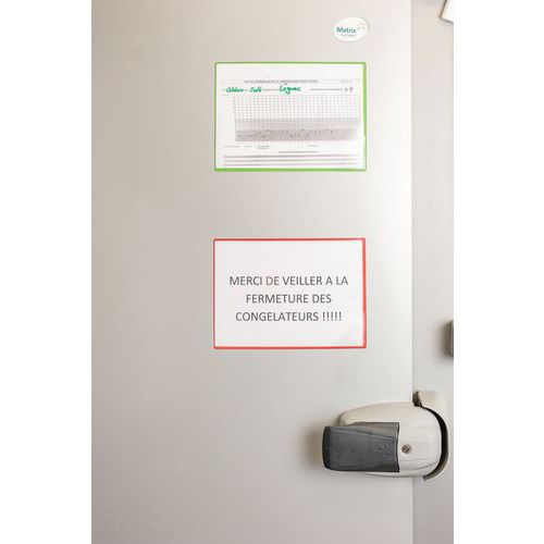 Magnetische insteekmappen Kang Easy Load kunnen op alle metalen oppervlakken worden bevestigd. Voor A4-documenten. Volledig magnetische rug voor een optimale hechting. Documenten zijn eenvoudig te plaatsen door de opening aan 2 zijden. Hoeksluiting Easy Load: handig en efficiënt voor het insteken en uitnemen van documenten. Kan staand of liggend worden gebruikt. Eenvoudige en snelle montage, zonder schroeven of spijkers. Kan worden losgetrokken zonder sporen na te laten. Kan staand en liggend worden gebruikt. Een presentatieoplossing voor gebruik op machines, deuren, metalen borden, koelkasten... Map van PVC met magnetische rug. Ruimte voor maximaal 10 vellen papier van 80 g. Volledig groene achterwand.
