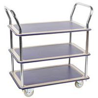 - Trolley met houten plateaus met buisframe van staal. Houten MDF plateaus, geschikt voor zware lasten.