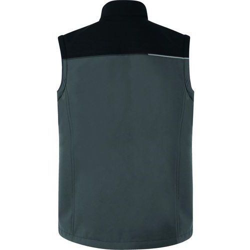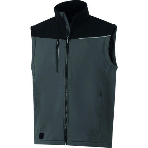 Softshell 2-in-1, winddicht en waterafstotend met afneembare mouwen. Materiaal: softshell 96% polyester 4% elastaan, 2 gelamineerde lagen. Gelamineerde voering: fleece 100% gerecycled polyester, 280 g/m². 6 zakken. Waterafstotende stof om het droog te houden bij fijne regen.