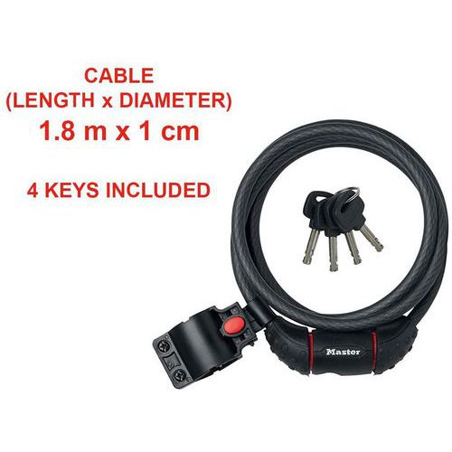 | Productnaam | Kabelslot met sleutels 1.8 m, Ø: 10 mm, Lengte: 1800 mm, Aantal sleutels: 2, Productgewicht: 0.51 kg |