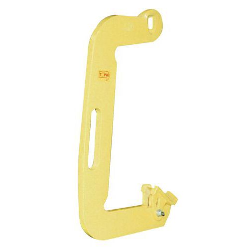 Kantelhaak voor het heffen en kantelen van spoelen en haspels. De C-vormige haak is voorzien van een scharnierende schoen waarmee de spoel kan worden gekanteld. Deze schoen fungeert tevens als veiligheidsbek als de last horizontaal getransporteerd wordt. Vervaardigd uit ultrasterk en verouderingsbestendig gelegeerd staal. Geleidingshandgreep voor een makkelijke plaatsing van de last.