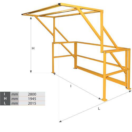 | Productnaam | Kantelhek Pallet Gate 2800 mm, Kleur: Geel, Totale lengte: 2015 mm, Totale hoogte: 1945 mm |