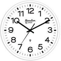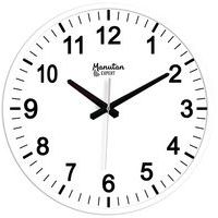 - Klassieke klok met grote diameter, zwart opschrift, witte achtergrond.