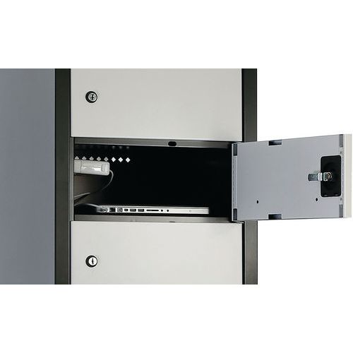 Lockerkast van staal met intern aansluitsysteem voor laptop.