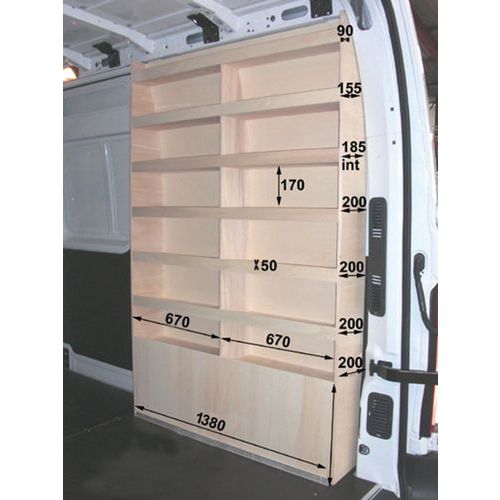 Zeer robuuste kast voor rechterkant van populieren multiplex. Heeft een grote opbergcapaciteit. Met vakken voor het gebruik van bakken. De bodem van de kast behoeft geen bekleding op de carrosserie. Eenvoudige montage en demontage van de kasten. Goedkope oplossing. Met geïntegreerde wieldoorgang in de kast. Uitgesneden door digitaal bestuurde machines, perfect aangepast aan de afmetingen van het voertuig. Kan worden geplaatst tussen de zijdeur en de achterdeur.