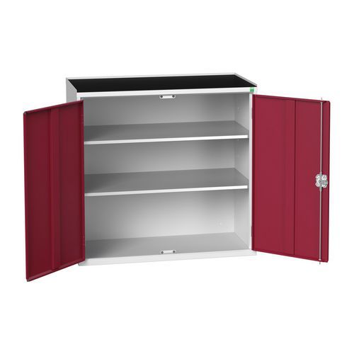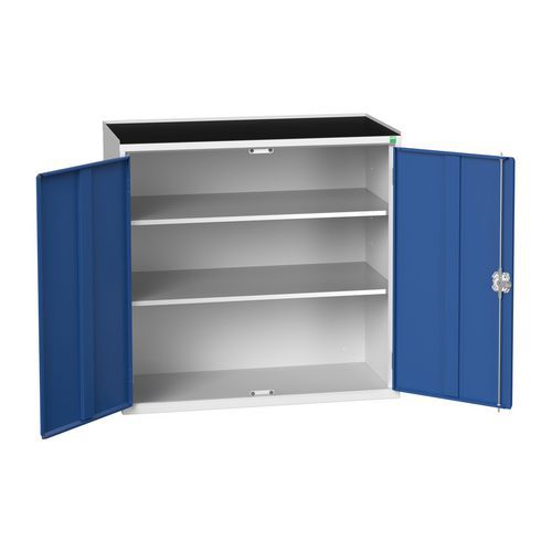 Gemaakt van plaatstaal met een slijtvaste gepoedercoate afwerking. Met 2 x 900 mm deuren gemonteerd met een 3-puntsslot. Geleverd met 2 gegalvaniseerde stalen legborden met een draagvermogen van 60 kg, verstelbaar in een raster van 25 mm.