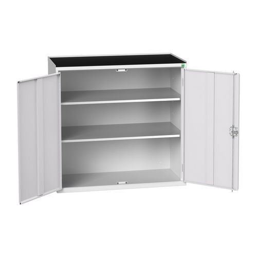 Gemaakt van plaatstaal met een slijtvaste gepoedercoate afwerking. Met 2 x 900 mm deuren gemonteerd met een 3-puntsslot. Geleverd met 2 gegalvaniseerde stalen legborden met een draagvermogen van 60 kg, verstelbaar in een raster van 25 mm. Gemaakt in het UK Max. belasting per legbord (kg) : 35