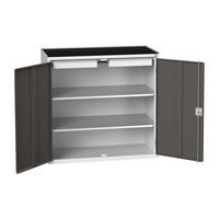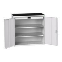 Gemaakt van plaatstaal met een slijtvaste gepoedercoate afwerking. Met 2 x 900 mm deuren gemonteerd met een 3-puntsslot. Geleverd met 2 gegalvaniseerde stalen legborden met een draagvermogen van 60 kg, verstelbaar in een raster van 25 mm. Compleet met: 1 x 100 mm lade, 1 x 100 mm lade, elk met een draagvermogen van 60 kg, geïntegreerde handgrepen en 100% uitschuifbare rollagergeleiders. Gemaakt in het UK Max. belasting per legbord (kg) : 35