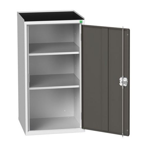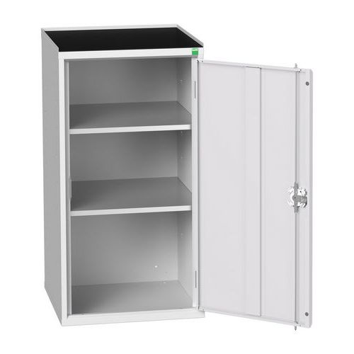 Gemaakt van plaatstaal met een slijtvaste gepoedercoate afwerking. Met 1 x 900 mm deur gemonteerd met een 3-puntsslot. Geleverd met 2 gegalvaniseerde stalen legborden met een draagvermogen van 60 kg, verstelbaar in een raster van 25 mm.