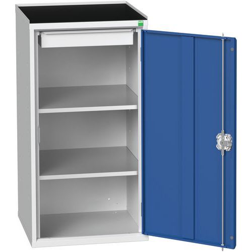 Gemaakt van plaatstaal met een slijtvaste gepoedercoate afwerking. Met 1 x 900 mm deur gemonteerd met een 3-puntsslot. Geleverd met 2 gegalvaniseerde stalen legborden met een draagvermogen van 35kg, verstelbaar in een raster van 25 mm. Compleet met: 1 x 100 mm lade, met een draagvermogen van 10 kg, geïntegreerde handgrepen en 100% uitschuifbare rollagergeleiders.
