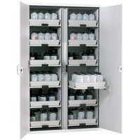 - Twee compartimenten zorgen ervoor dat de voorraad gescheiden wordt van zuren en basen in een grote kast.