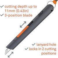 Gepatenteerde penvormig handvat voor betere grip, met keuze uit 3 bladposities, zodat de gebruiker de juiste hoeveelheid van het mes kan kiezen voor de taak.