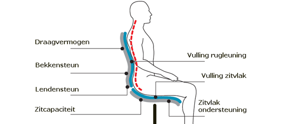 - In hoogte verstelbare armleuningen : om spanning op de rug te verlichten. Bekleding: een stevige kwaliteit schuim is belangrijk om lang steun te blijven bieden. Het moet zo gevormd zijn dat dit het lichaam comfortabel omsluit.