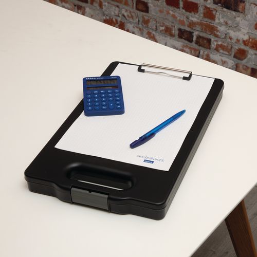 - Kunststof klembord met stevig schrijfoppervlak en opbergvak.