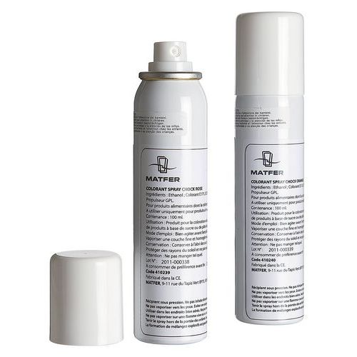 Kleurspray voor voedingsmiddelen, speciaal voor chocolade, ideaal voor decoratie van gegoten of samengestelde bereidingen. Spuitbus, eenvoudig te gebruiken.