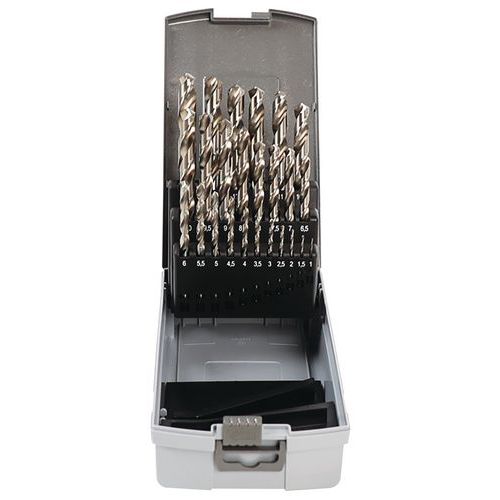 - Koffer met 25 standaard boren met cilindrisch uiteinde, geslepen, van HSS-snelstaal Ø 1 tot 13 mm.