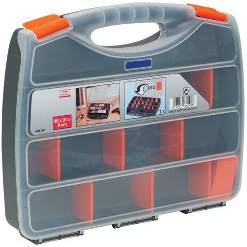 Koffer met tussenschotten, eenvoudig te verplaatsen met 2 sluitingen ter hoogte van de handgreep. De vakken kunnen in 25 kleine vakken worden verdeeld met verwijderbare tussenschotten. Transparant deksel om snel te zien wat erin zit.