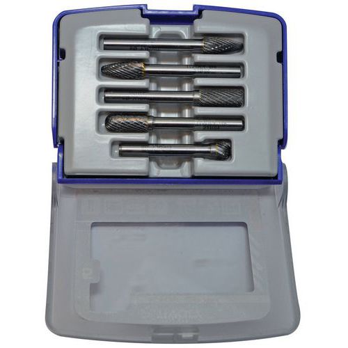 | Productnaam | Koffer met vijlfrezen carbide Ø 8 mm recht, Aantal stuks: 5, Materiaal: Staal, Type steun: Kunststof |