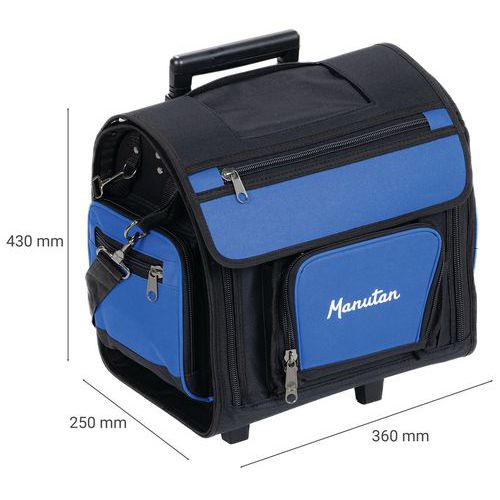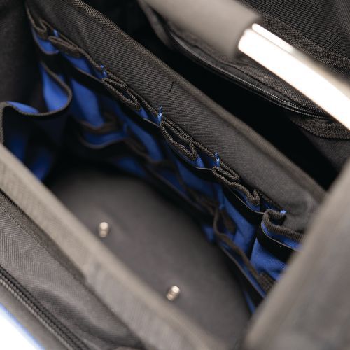 - Koffer-trolley van textiel voor gereedschap, bestand tegen water, slijtage en scheuren.