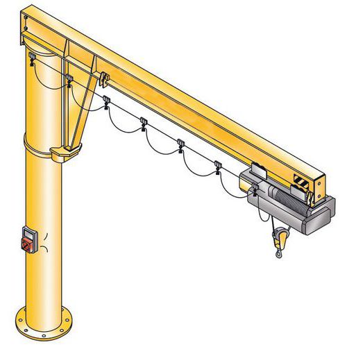 Kolomzwenkkraan met verhoogde giek met een totale zwenkhoek van 360°. Zeer gemakkelijke rotatie, dankzij een soepel lopende lager (bovenaan de kolom) en rollen (in het onderste gedeelte van de arm). Standaardhoogte onder balk: 3 m.