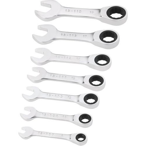 | Productnaam | Korte ringsteeksleutelset met ratelring, Aantal sleutels: 7, Omkeerbare ratel: nee, Coating: Verchroomd |