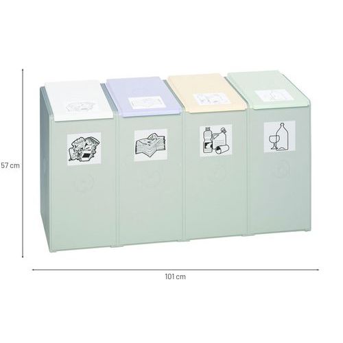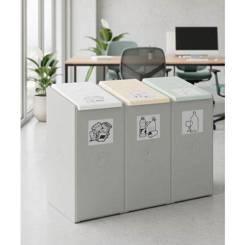 Recyclingmodule van kunststof. Creëer een ruimte voor afvalscheiding dankzij de verschillende gekleurde deksels. Inrichting naar uw behoeften. Gebruik deze modules voor een esthetisch resultaat.