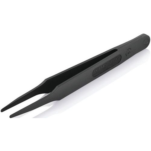 Verkrijgbaar als herbruikbare ESD- of wegwerpvariant ESD-pincetten zijn gemaakt van 30% koolstofvezelversterkte kunststof, geleiden zowel elektrisch als thermisch zeer goed en kenmerken zich door een hoge slijtvastheid en krasvastheid Alleen ESD-versies: met een oppervlakteweerstand tussen 10^2 en 10^4 ohm voor de gecontroleerde vereffening van potentiaalverschillen tussen de gebruiker en elektronische componenten