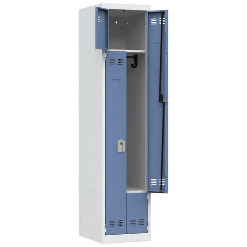 L-vormige, ruimtebesparende garderobekast 3 kolommen. Geeft elke gebruiker het voordeel van een opbergvak en een hangkast. De inhoud van de opbergruimte is zo maximaal te benutten. Veiligheidstips: - Plaats het meubel op een vlak oppervlak - Bevestig het aan de muur of een scheidingswand met een speciale bevestiging - Let erop dat u de aanbevolen maximale belasting niet overschrijdt en zorg voor een goede verdeling