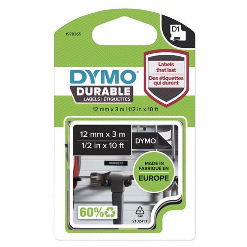 Label Dymo D1, duurzaam, waterbestendig voor binnen en buiten. Dankzij de industriële lijm blijven de etiketten plakken op een groot aantal oppervlakken. Perfect voor mokken, waterflessen en bakken voor het bewaren van voedingsmiddelen. Materiaal is bestand tegen schaven en scheuren waardoor de tekst goed leesbaar blijft. Bestand tegen UV-straling, warmte, vocht, schoonmaakmiddelen voor huishoudelijk gebruik en omstandigheden in de buurt van vorst. Ideaal voor etiketteren in keukens, provisiekasten, opbergkasten, washokken, ateliers of garages.