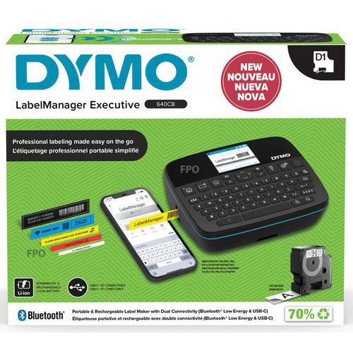 Professionele en veelzijdige labelprinter LabelManager® Executive LM640 CB QWY - Dymo. Draagbare en oplaadbare labelprinter met dubbele connectiviteit. Compatibel met de labels D1 Standard en Durable in de breedtes 6, 9, 6,12, 19 of 24 mm. Moeiteloos draagbaar dankzij een oplaadbare lithium-ion batterij. Ruimtebesparend ontwerp met compacte afmetingen en een gestructureerd oppervlak voor een ergonomische grip.