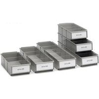 Bakken voor legplanken zijn ontworpen om te passen bij alle legborden, kasten, draaiende steunen en standaard industriële werkplekken. Ons assortiment bevat 11 bakken van verschillende maten. Verkrijgbaar in de volgende diepten: 3, 4, 5 en 6 mm. Iedere lade heeft ruimte voor een etiket en heeft een deksel. Materiaal: PS = transparant polystyreen: gebruikstemperatuur -4 °C tot +55 °C. PP = gekleurd polypropyleen: temperatuur van -2 °C tot +75 °C. Niet vatbaar voor oliën en de meeste zuren en oplosmiddelen.