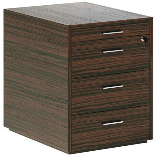 18 mm dikke spaanplaatdoos, 0,6 mm dik houtfineer, met 1 mm en 0,6 mm dikke houten rand, 0,5 mm stralende hoeken en gelaktmat transparant met halfopen poriën. Sokkel met 3 laden in metaal met epoxypoedercoating, aluminium afwerking, met volledig uittrekbare kogelgelagerde geleiders en geïntegreerd zacht systeem + treklippennenbakje met gedeeltelijke uittrekrails. 4 afstelaansluitingen.