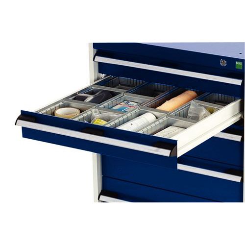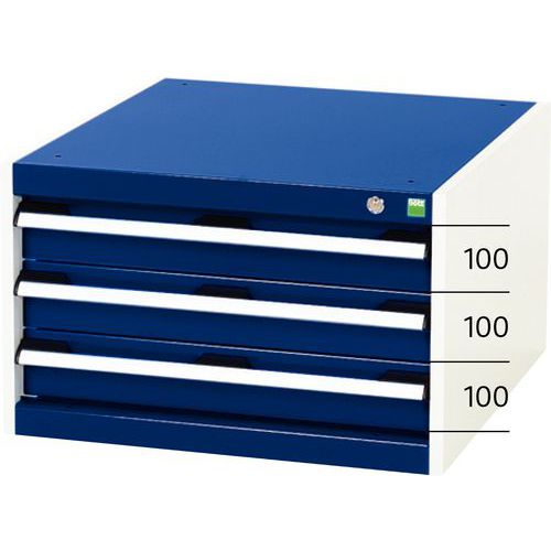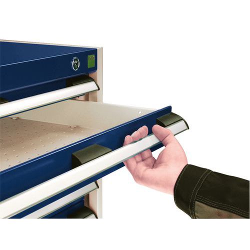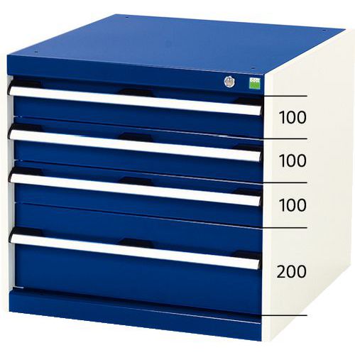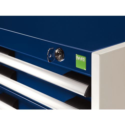 In hoogte verstelbare laden in stappen van 25 mm. De laden gaan 100% open: complete toegang tot de inhoud. Centrale vergrendeling met sleutel. De laden zijn gemonteerd op lagers.