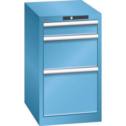 Grote stabiliteit van het geheel met een draagvermogen tot 4 t, laden met een draagvermogen tot 75 of 200 kg Optimaal gebruik dankzij de totale uitbreiding en de optimale hoogte aan de voorzijde van de laden Uitstekende bescherming tegen stof, vloeistoffen en mechanische slijtage dankzij een gesloten geheel met een oppervlak dat bestand is tegen schokken en slijtage Onfeilbare veiligheid met anti-losmaaksysteem dat voorkomt dat de lade eruit valt en met individuele ladeblokkering (antikantelbeveiliging) Bescherming tegen corrosie dankzij een elektrostatische dompellak en spuitlak Optimale opbergmogelijkheden en organisatie dankzij het materiaal voor indeling van LISTA, geschikt voor elke toepassing en dankzij de laden die zijn voorzien van uitsparingen en perforaties Professionele etikettering met de etiketteersoftware van LISTA Script en de inklapbare grijpstang voor de invoering van etiketten Perfect stille verplaatsing dankzij de rail zonder verbindingsstuk